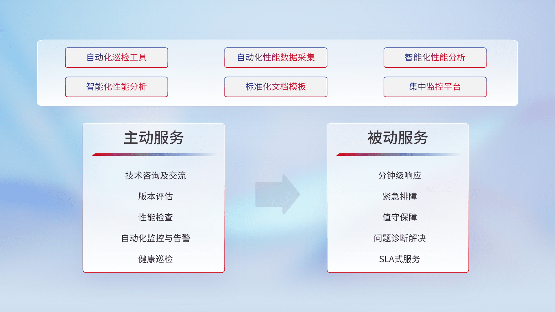 智能化工具和标准化文档,,,,保障服务质量,,提供主动服务(包含技术咨询、、、、版本评估、、、性能检查、、自动化监控与告警、、、、健康巡检)和被动服务包含(分钟级响应、、紧急排障、、值守保障、、、、问题诊断解决、、、、SLA服务)。。