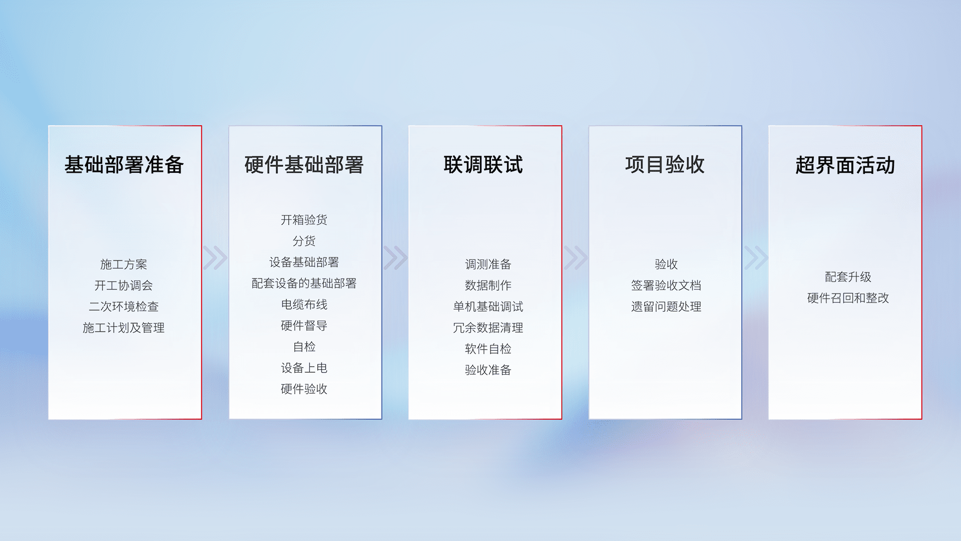 从基础部署准备、、、硬件基础部署、、、联调联试、、、项目验收、、越界面活动的全过程可追溯,,保证施工质量和进度。。